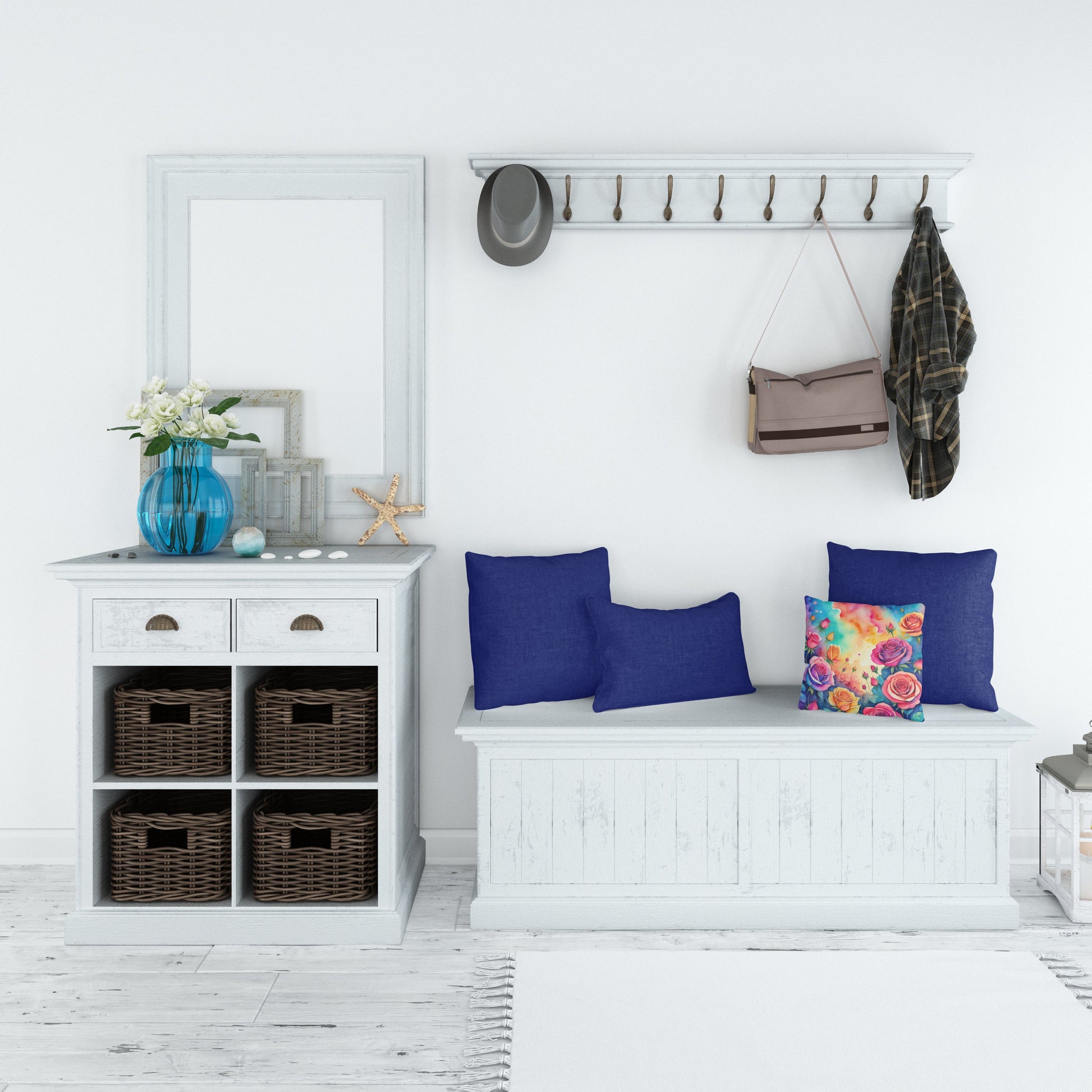 Throw Pillow featuring breed specific Roses artwork. Add a touch of vibrancy and comfort to your outdoor seating with Caroline's Treasures Fabric Decorative Pillow. Measuring approximately 14 inches by 14 inches, this outdoor pillow is crafted to elevate the appeal of your patio furniture, infusing it with vivid color and artistic flair. The pillow includes a 100% Polyester Fabric sham filled with a quality pillow form to provide superior comfort. Innovatively made from our brand new material, specifically woven for its water resistance, this pillow is designed for durability. The soft canvas fabric offers versatility in use, fit for your indoor couch or your outdoor patio, porch, or veranda. The fabric is dyed with colorfast dyes built for resilience against weather conditions, ensuring the pillow retains its beauty over time. Constructed by sewing three fabric pieces to create a sham, the polyester insert is then nestled inside to form the pillow, resulting in an overstuffed pillow that maintains its shape. Both the sham and the pillow insert are proudly made in the United States. As the pillows are handcrafted, there may be minor variations in size, further enhancing their unique charm. Experience comfort in style with Caroline's Treasures Fabric Decorative Pillow.